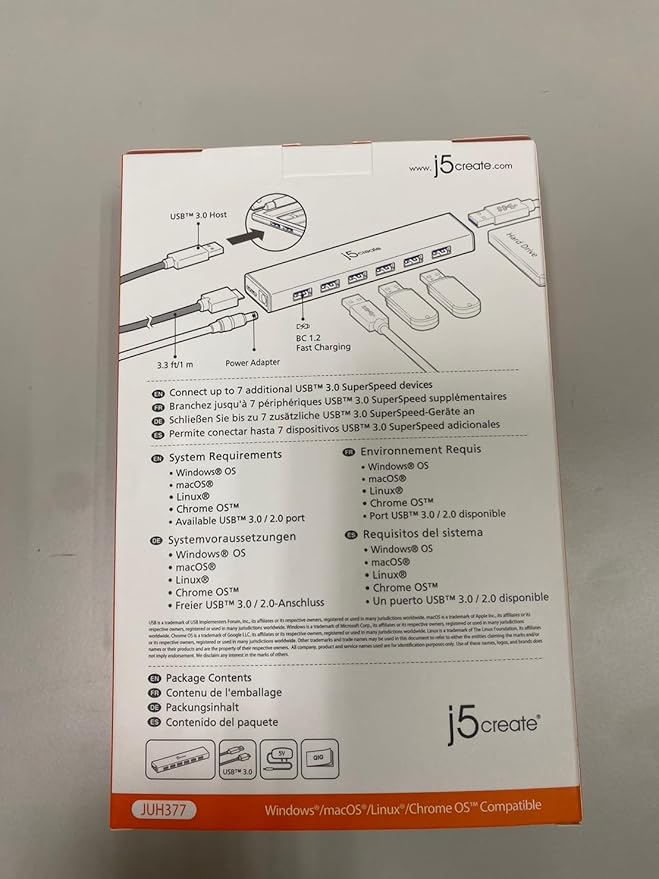 j5create 7-Port Powered USB 3.0 Data Hub with 3.3 ft Extended Cable [20W Power Adapter Included] for Mac, MacBook, Windows, Laptop, Surface, XPS, PC (JUH377)