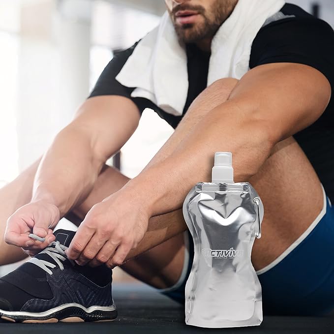 Collapsible Reusable Water Bottle with Carabiner Clip by Activiva - Light Weight Leak Proof Foldable Drinking Water Bottle - Non-Toxic BPA Free - 16.9 oz - 4 Pack
