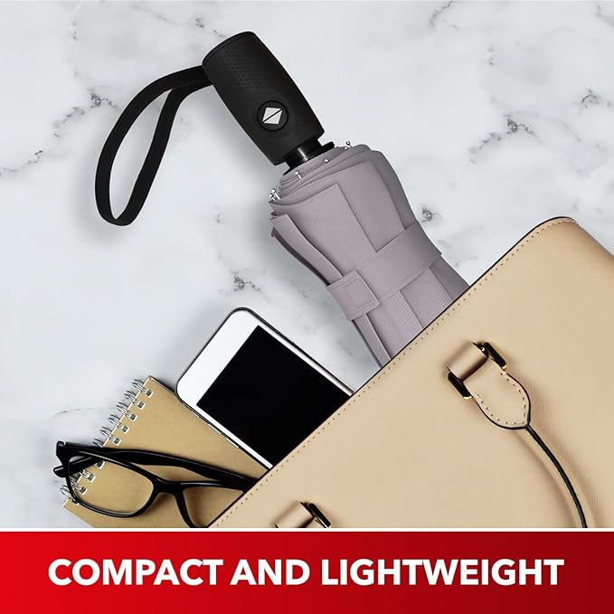 - AUTOMATIC OPEN AND CLOSE FEATURE: With one-touch push button control, this collapsible umbrella easily opens and closes instantly with little force. Repel deploys out fast and folds away in seconds, fitting easily into purses, backpacks, even your car or truck door. Its ergonomic handle provides comfort and a secure grip, while the quick-dry full canopy repels rain to keep you cool and dry in style for work commutes, fun trips, or everyday outdoor activities.