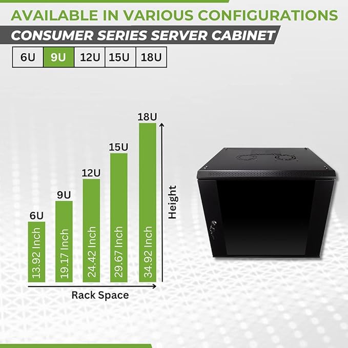 - CONVENIENT DESIGN: This 9U cabinet features a reinforced, heat-treated, tempered glass front door with a security lock. Perfect for applications requiring both security and accessibility, its compact design of 17.72"L x 21.65"W x 19.17"H offers a practical solution for space-constrained settings