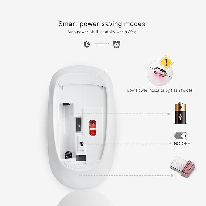 - 【Stable Connection and Power Efficient】The 2.4 GHz wireless mouse provides a powerful, reliable connection, effective up to 10 meters of range. This mouse will auto sleep after 8 minutes of inactivity for power saving, it can be waken up by clicking any button. 1 AA battery needed (not included in the package)