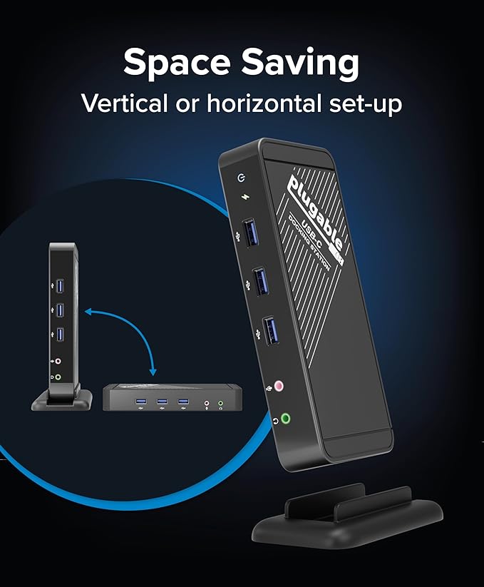 - Space-Saving Versatility with Efficient Charging - Designed to adapt, the dock can be placed vertical with the stand or be positioned horizontally, making it easy to fit into any workspace. This versatile laptop docking station with power provides up to 60W of USB-C power delivery to keep your devices charged while maintaining a clean layout.