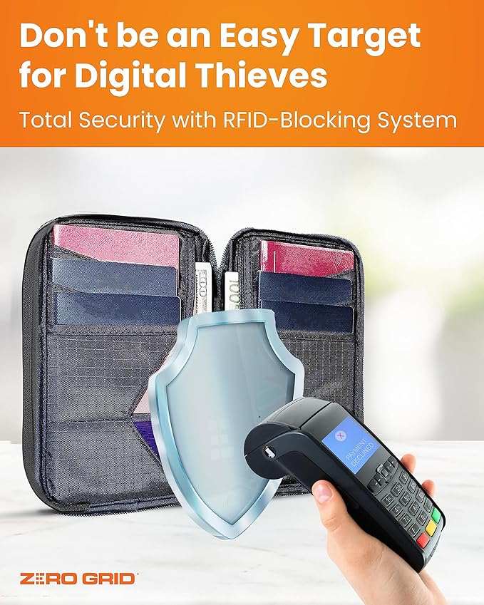 - YOU GO PLACES, YOUR FAMILY'S PERSONAL INFORMATION DOESN'T - Built with Industry Leading RFID Blocking Technology, you stay Protected from Unwanted Scans. Your cards and personal information are PROTECTED FROM IDENTITY THEFT.