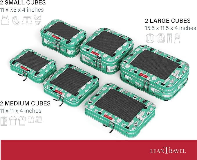 LeanTravel Compression Packing Cubes for Travel Organizers with Double Zipper (6-Pack (2L+2M+2S), Green Cactus)