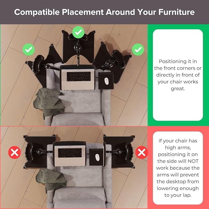 - PREMIUM ROLLING DESK WITH ERGONOMIC DESIGN – Built from anodized aluminum and durable polymers for long-lasting strength. Space-saving base hugs furniture corners while the swing arm extends over your lap. Locking casters make moving between rooms easy. Patented mouse tray stays level when swiveling and can be positioned left or right. Designed from decades of user feedback for comfort and stability.