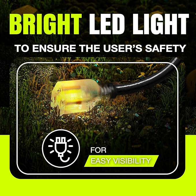 - LIGHTED END FOR VISIBILITY & SAFETY: With a lighted end to indicate power and a brightly colored PVC jacket, this three prong extension cord minimizes tripping hazards and improves safety in busy or poorly lit areas. Stay safe while powering up with an easily noticeable extension cable. The innovative design not only enhances operational safety but also ensures that the indoor / outdoor power cord is easily identifiable among your tools and equipment, preventing accidental disconnections.