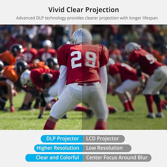 - Clear and Bright Projection: Using advanced DLP (0.2DMD Optically processed chip) projection technology, the image produced is clearer compared to LCD projectors, maintaining good sharpness at any size without pixelation or the "screen door effect". It also provides higher brightness and richer color effects, ensuring clear and sharp visuals whether watching movies on a large screen or using it for small decorative projections.