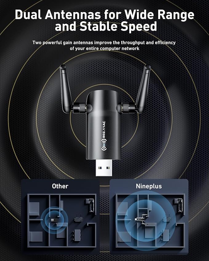 - Fast 1300Mbps USB WiFi Adapter - Nineplus wifi adapter provides long-range and stable wifi connections,Upgrade your desktop or laptop wifi Technology with our AC1300Mbps usb wireless Adapter. Whether your desktop pc's wifi usb is malfunctioning or you’re looking to upgrade to faster dual-band 5GHz and 2.4GHz speeds, this pc wifi adapter is the ideal choice. It’s a budget-friendly way to extend your device’s life and experience the benefits of modern WiFi technology