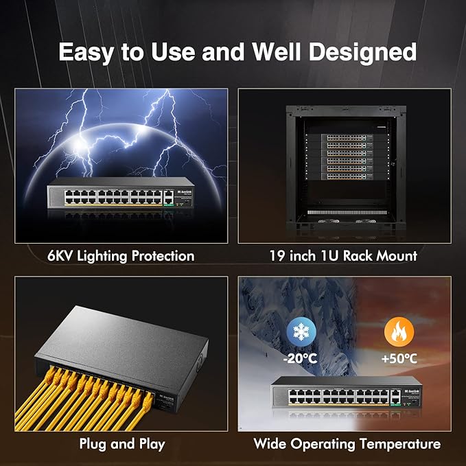 - 26 Ports: Includes 24 POE ports(10/100Mbps) and 2 gigabit UpLink ports(10/100/1000Mbps). The 2 gigabit uplink ports can provide more bandwidth and connect to different devices, such as routers, NVRs, etc.