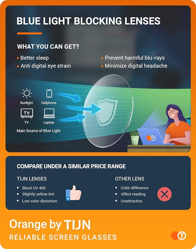 - ☀Anti Blue Light Glasses - With yellow filter lens, Tijn Blue Light Glasses can effectively block 100% harmful UV rays and relieve our eye fatigue especially when watching TV, looking at computer or using other electric products.