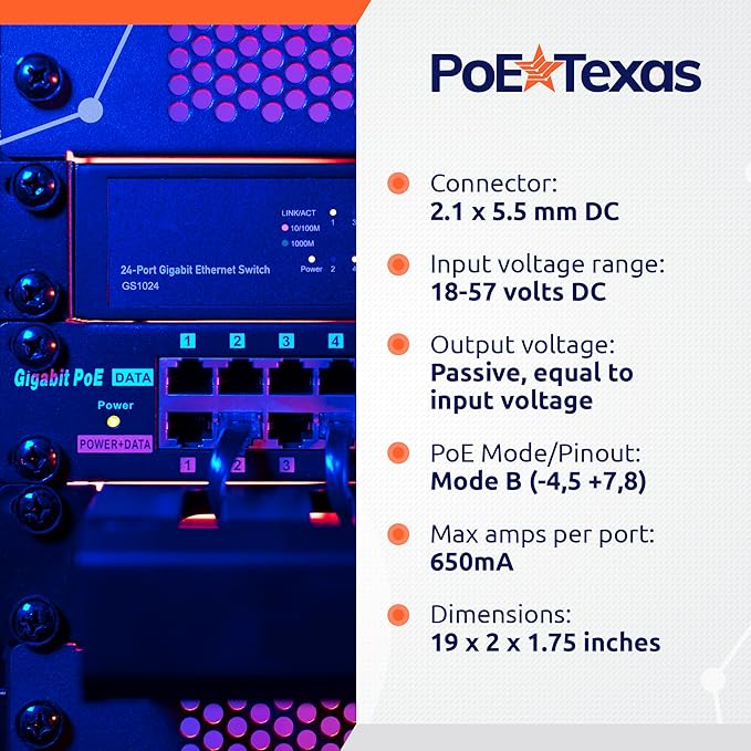 PoE Texas 24 Port PoE Injector - Multi-Port PoE Gigabit Rack Mount Midspan for IP Cameras, Phones, WiFi AP, Add Power Over Ethernet to Non-PoE Switch or Network Router, Includes 56v 240w Power Supply