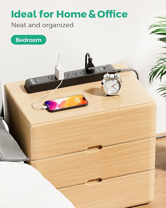 - 【Power Strip with USB】 - This slim power strip features 4 USB charging ports (5V/2.4A Each) and 6 AC Electrical outlets. USB charging ports with smart technology sharing 3.1A power, auto-detect your devices and supply the maximum charge speed for your devices.