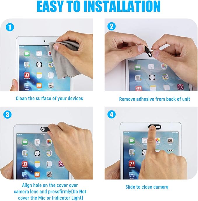 - 【Easy To Install And Use】Just need to simply remove the back sticker and align the camera cover slide to your webcam, attach and press firmly for 15 seconds for a strong. The strong gel provides a durable and reliable connection between your devices and camera cover. Also, the adhesive can be easily applied and removed from the device without leaving any traces.