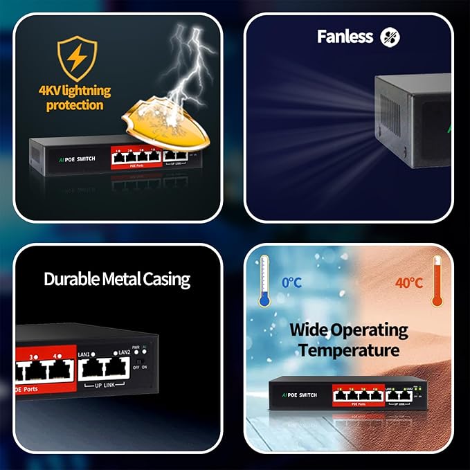 - 【4 port poe switch*100M@52W 】PoE switch with 4 port PoE + 2 Uplink port,4× PoE ports providing up to 30W per port, total PoE budget 52W,2 port uplink ideal for connecting NVR and Internet , etc.