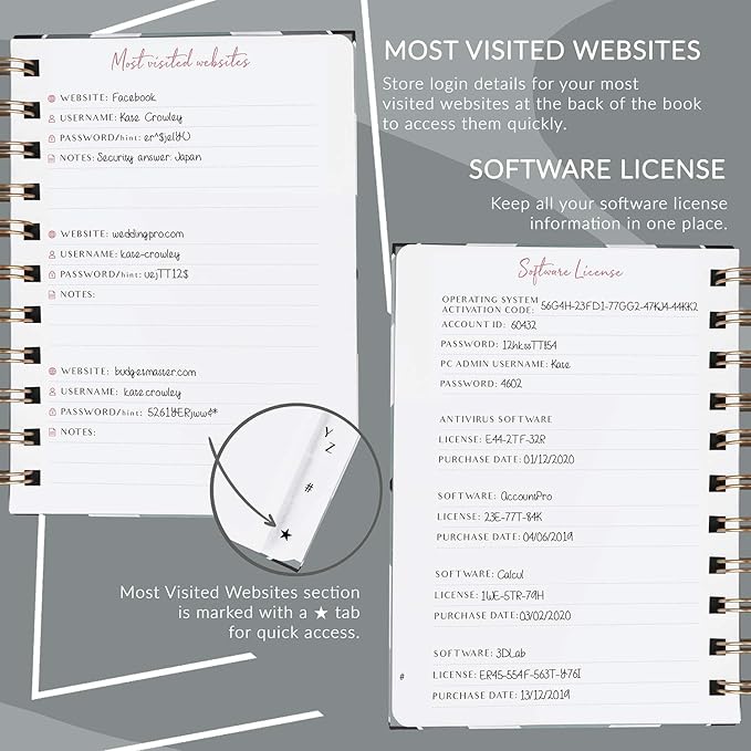- ALL-IN-ONE PASSWORD & COMPUTER INFO STORAGE – More than just a pocket password notebook, this pocket internet password logbook includes pages for Wi-Fi and email settings, software licenses, and extra notes—keeping all your important information in one safe place.