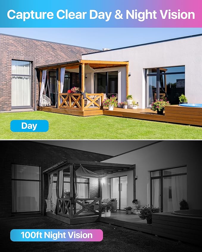 - 【Night Vision】Built-in 36pcs IR LEDs, with the camera's automatic IR-CUT filter, clear images can be obtained both day and night. Up to 100ft night vision in total darkness and 120ft Night vision in ambient light. It provide color video during the day and black-and-white video at night.