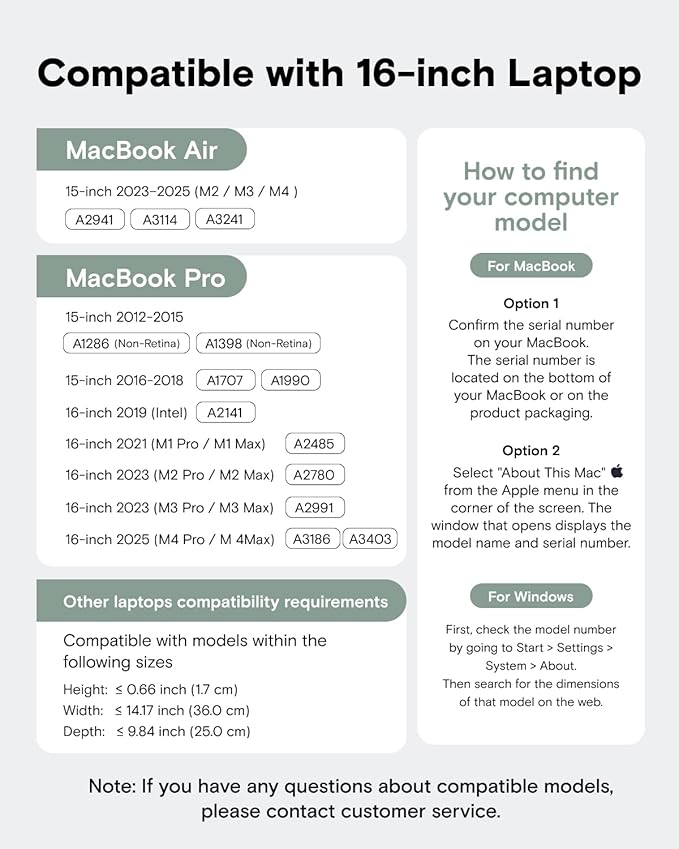 - Compatibility: Designed for 15-16 inch laptops. Laptop sleeve dimensions: 15.8 x 10.5 inch, Maximum compatible size: 14 x 9.8 x 0.7 inch. Laptop sleeve Precisely fits MacBook Air 15-in.(M2/M3/M4, 2023-2025), MacBook Pro 16-in.(M4 Pro/M4 Max, 2025), MacBook Pro 16-in.(M3 Pro/M3 Max, 2023), MacBook Pro 16-in.(M2 Pro/M2 Max, 2023), MacBook Pro 16-in.(M1 Pro/M1 Max, 2021), MacBook Pro 16-in.(intel, 2019), MacBook Pro 15-in (2016-2018), MacBook Pro 15-in (2012-2015)
