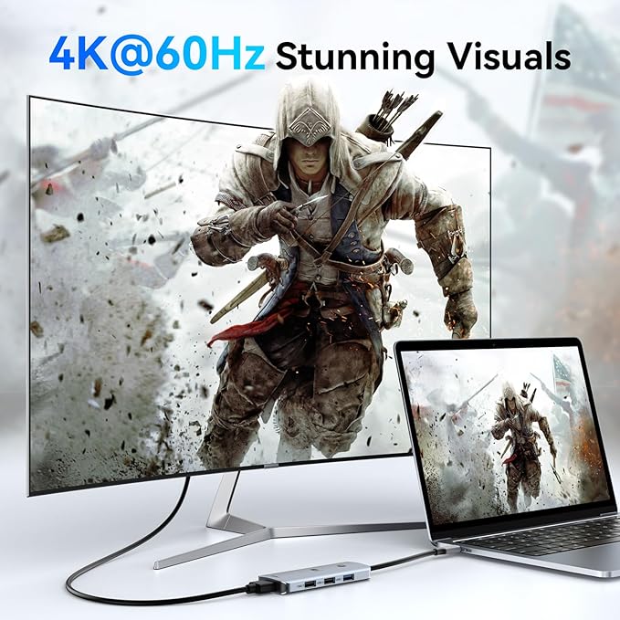 - 4K Video with 2 HDMI: Use HDMI port to enter extend mode for usb c laptops and transfer 4K HD @ 60Hz from laptop screen to a monitor, projector, HDTV, etc. Stream movies, presentations or video games on your monitors in one click