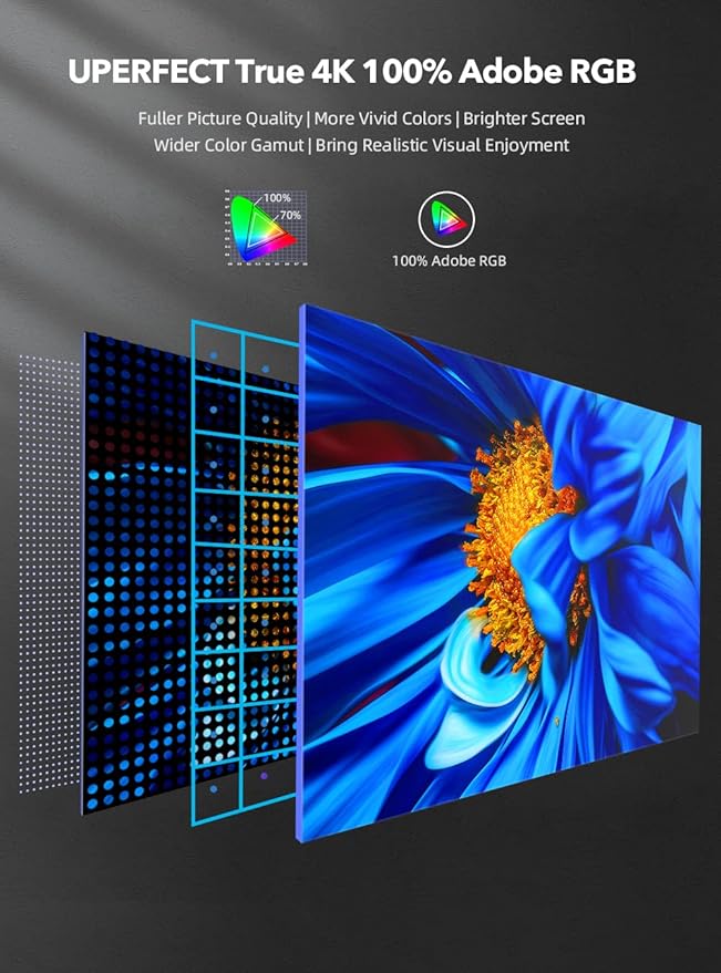 - UPERFECT Truely 4K IPS Screen: UPERFECT features an true 4K IPS panel technology, which allows for wider view angles and better color accuracy compared to other LCD panel types; With a resolution of 3840x2160 pixels, which is 4 times resolution of FHD monitor, resulting in incredibly sharp and detailed images; The IPS technology ensures that colors are consistent and accurate from any viewing angle, ideal for color-critical work such as graphic design, photo editing, or video production
