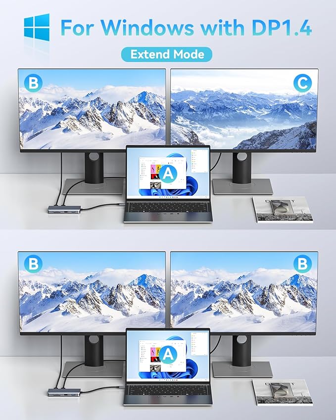 - 【Ultra 4K HDMI】 Outputting in 4K video quality, this usb c to dual hdmi hub maximizes the working efficiency for all visual creators. This usb c hub dual HDMI presents an Ultra-High-Definition video through 1HDMI for 4K 3840*2160@60Hz, 2HDMI for 4K 3840*2160@30Hz. Note: Limited by Apple Mac OS system itself, Mac OS system can only support SST mode, the display of 3 screens will be Laptop(A)+Monitor1(B)+Monitor2(B)