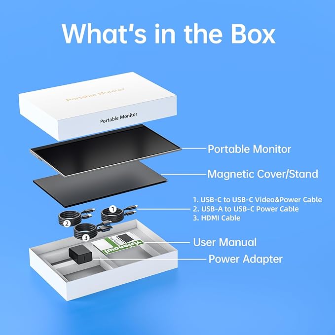 - High Performance Display with All Accessories: 2 built-in stereo speakers provide an immersive experience for music, movies, video games. This portable monitor comes with 3 cables (HDMI; USB-C to USB-C; USB-A to USB-C), a power adapter, and a magnetic cover. 15.6-inch portable screen, wide color gamut, 178° viewing angle, 3ms response time, HDR, Eye Care, Low Blue Light, and FreeSync features, brings you an immersive visual experience.