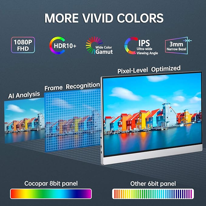 - 1080P HDR Monitor: 15.6 inch 1920x1080 Super Clear IPS A-grade screen. 1080p resolution, 178° FULL viewing angle, wide color gamut, FreeSync, HDR, Low Blue Light features. Born to deliver you stunning visuals with awesome color reproduction
