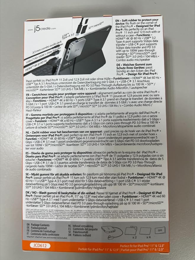 j5create iPad Pro USB C Hub- 6-in-1 Travel Dock for iPad Pro 12.9”/11”, with 4K@60Hz HDMI, USB C PD Charging 100W & Data, USB A 3.1, SD and microSD Card Reader, 3.5mm Headphone Jack (JCD612)