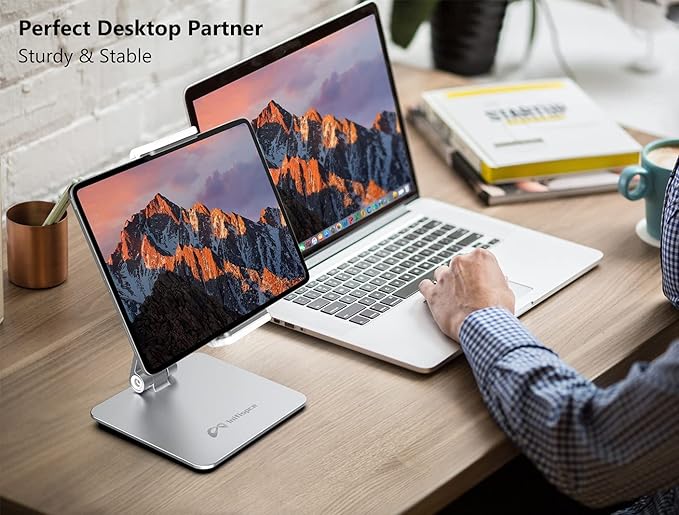 - 【New Design】 A perfect iPad desktop stand accessory that frees your hands to zoom meetings, watch videos, use Facetime, view recipes and enjoy games. Protect you from neck and shoulder pain.