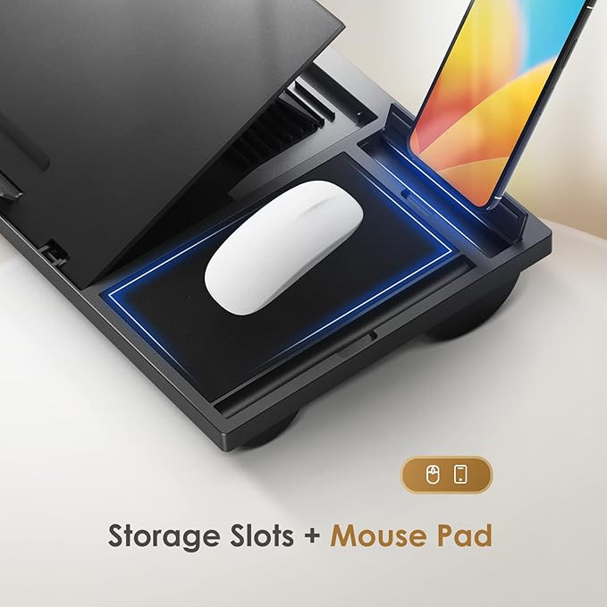 - βIDEAL SIZE: The laptop desk adjustable platform measures 13.8β x 9.9β and is big enough to fit most 17β laptops or a large tablet-oriented vertically for reading. Laptops larger than 15.6ββ may extend beyond the edge of the platform, but it does not affect the stability during use. There is enough surface space for a mouse to slide smoothly on the mouse pad.