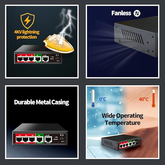 - Enterprise-Level Performance-Faster, More Secure Networking: Unlock enterprise-level capabilities with the STEAMEMO 4-port PoE network switch. It offers automatic cable quality detection, precise bandwidth control, QoS, 802.1Q VLAN support, DHCP Snooping, and port mirroring. Boost security with storm control, static MAC addressing, and flow control, ensuring stable, lag-free performance for streaming, gaming, and business applications.