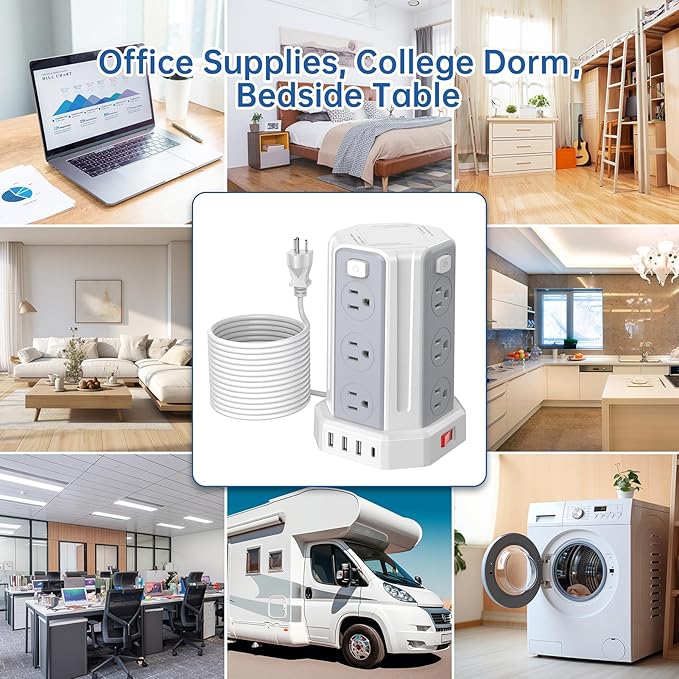 - 【16-in-1 Surge Protector Power Strip Tower with Long Extension Cord】 Maximize workspace efficiency with this versatile 6.5FT/10FT/16.4FT heavy-duty extension cord power strip, combining surge protection and extended reach. Its compact tower design organizes 12 AC outlets + 4 USB ports (3 USB-A + 1 Type-C) to declutter desks in homes, offices, or dorms. The extended surge protector outlet eliminates cable chaos while providing flexible placement anywhere indoors.