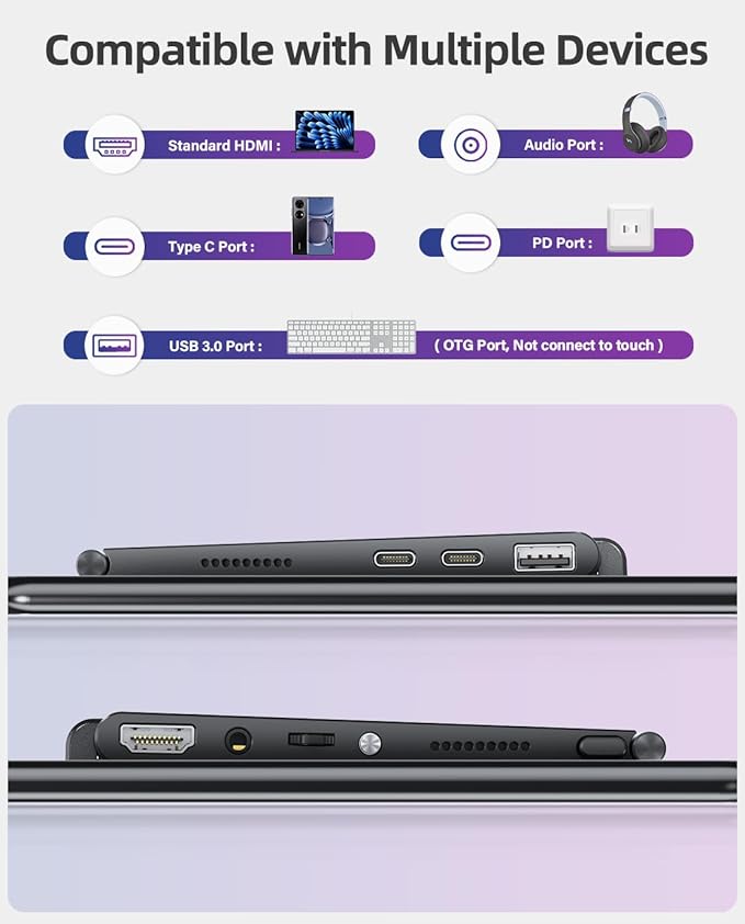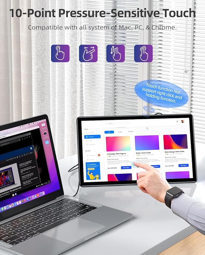 - 10-point Capacitive Touchscreen Monitor: Compatible with all system of PC, & Chrome; Adopted G+FF technology, support much more precise and sensitive touch, no extra driver needed, just connect the USB cable to your device to achieve the touch; NOTE: To realize the touch function, there must be a USB C to A or USB C to C cable connected to the USB C port on the monitor to your device directly; The touch function does not support right-click and long-press to activate the option operation