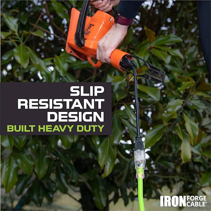 Iron Forge Cable Weatherproof 25 Ft Outdoor Extension Cord - 12/3 SJTW 15 Amp Heavy Duty Light Green High Visibility Cable with 3 Prong - Lighted End