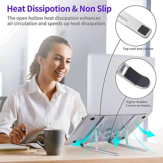 - 【Heat Dissipation & Cooling】100% Aluminum alloy material can absorb and discharge heat easily. This laptop riser raises computer thus the hollow design offers great heat dissipation and natural airflow, preventing your laptop from overheating during use.