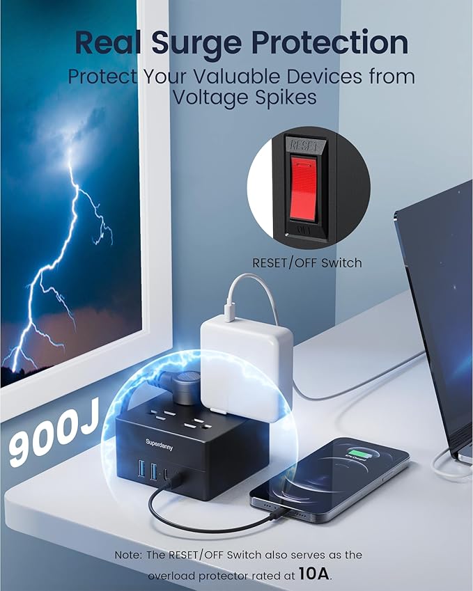 - ▶【All-Round Protection Technology】With a built-in 900J surge protector, our electrical multi-outlets will filter the minor surges in the circuit and shut off when an overwhelming surge occurs, like that caused by lightning. And the shell is made of Flame Retardant Material which is able to withstand temperatures high up to 1,380℉ (750℃). Besides, this universal power socket also has over-load/ short-circuit/ USB over-voltage/ USB over-current/USB over-heated protection.