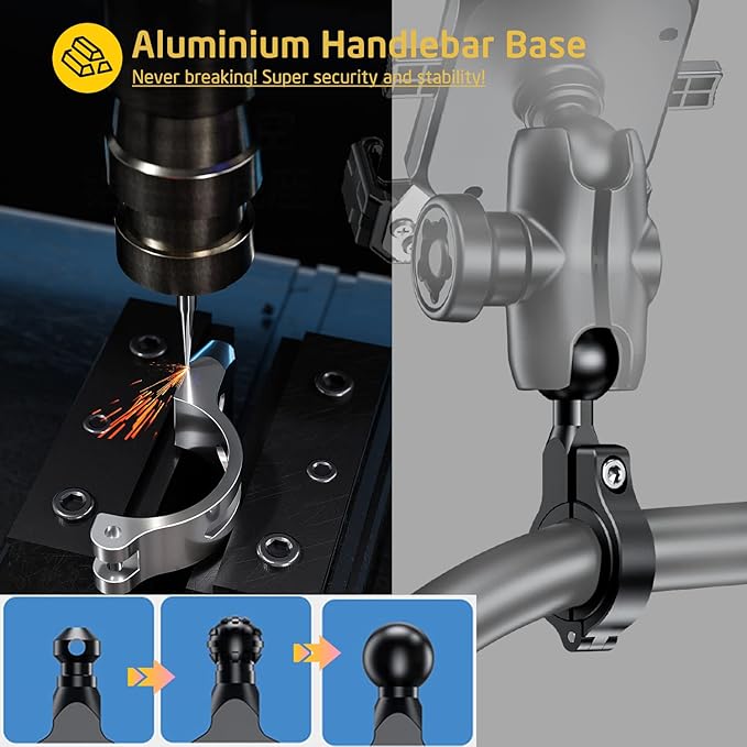 - Aluminum Handlebar Base for Super Sturdy: Made from aluminium alloy handlebar mount base, stainless steel clamping arms, the bike phone mount makes sure the phone stable and the mount sturdy on the motorcycles. NEVER BREAK OR SHAKE!