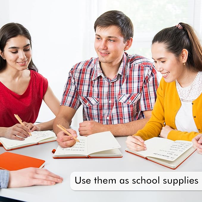 - Feela 24 Pack Classic Ruled Notebooks contains 24 classic orange ruled sturdy cover notebooks and 24 Black Retractable Pens. Each of the notebooks measures 8.3” x 5.1”, which is perfect to carry and easily held by young girls and boys. These black cute pens are customized to be placed in the pen holder, which is pretty convenient.