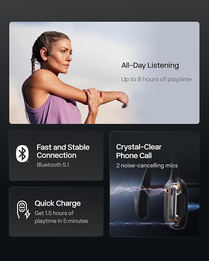 - 10 Hours of Music & Calls - Enjoy ten continuous hours of music, calls and podcasts with our Bluetooth headphones. OpenRun Pro also features a 5-minute quick charge for up to 1.5 hours of battery life