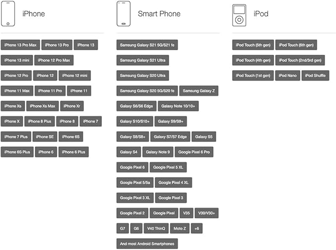 - Compatible Phone Models : Apple iPhone 16 / iPhone 16 Plus / iPhone 16 Pro / iPhone 16 Pro Max, iPhone 15 / iPhone 15 Plus / iPhone 15 Pro / iPhone 15 Pro Max, iPhone 14 / 14 Plus / 14 Pro / 14 Pro Max / SE 3 / 13 / 13 Pro / 13 Pro Max / 13 Mini / 12 / 12 Pro / 12 Pro Max / 11 / 11 Pro / 11 Pro Max / X / XR / Xs / Xs Max / 8 / 8 Plus / 7 / 7 / 6 / 6S / Plus, AirPods, AirPods Pro, Samsung Galaxy S24 Ultra / S24+ / S24 / S24 FE / S23 Ultra / S23+ / S23 / S23 FE / S22 Ultra / S22+ / S22 / S21 / S21+ / S21 Ultra 5G / S20 / S20+ / XCover6 Pro / Note 20 / Note10 / Note10+ / S10 / S10+ / S10e / S9 / S8, / Z Fold6 / Z Flip6 / Z Fold5, Z Flip5, Tab S9 Ultra, S22 Ultra 5G / S22 Plus / S21 Ultra 5G / S21+ 5G / S21 5G / Note20 Ultra 5G / Note20 Ultra / Note20 5G / 20+ 5G / S20 Ultra / S20 5G / S20 Ultra 5G / S10 / S10+ / S10E / S9 / S9+ / S8 / S8+ / Note 8 / S7 / S7 Edg e/ S6 / S6 Edge / S5 / S4 / A72 / A70s / A52 5 / A35 / A25 / A15 / A20s / M30s / M10s / A90 5G / A30s / A50s / LG K92 5G / K62 / Q52 / K52 / K42 / K71 / Stylo 6 / V50S ThinQ 5G / G8X ThinQ / Q70 / K30(2019) / K20(2019) / K40S / K50S/ W30 Pro/ W30 / W10 / Stylo 5 / V50 ThinQ 5G / G8S ThinQ / G8 ThinQ / Q60 / K50 / K40 / Q9 / V40 ThinQPixel 5 / 4a 5G / 4a / 4 XL / 4 / 3a XL / 3a / 3 XL / 3 / 2 / 2 XL / XL / Google Pixel 9/9 Pro / 9 Pro XL / 9 Pro Fold / 8/8 Pro/8a/7a/Pixel Fold/7 Pro/7 P/6 Pro/6/6a/5/5a/4a/4 xl/3a xl/3a/3 xl/2 XL, LG Stylo 6/5/4/3/2, LG G8/G7/G6/G5/G4/G3, Nexus, OnePlus 12 / 11 5G / 12R / Open / Nord N30 5G / 3 / 2 / X; Kindle Fire New HD 10 9 8, Sony, Nokia, XiaoMi, Huawei, Motorola, Nintendo Switch, and other Devices Apple iPhone 16 / iPhone 16 Plus / iPhone 16 Pro / iPhone 16 Pro Max, iPhone 15 / iPhone 15 Plus / iPhone 15 Pro / iPhone 15 Pro Max, iPhone 14 / 14 Plus / 14 Pro / 14 Pro Max / SE 3β¦ See more