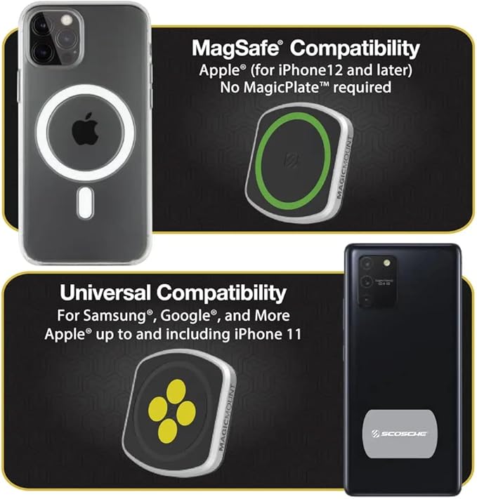 - COMPATIBLE/REPLACEMENT for MagSafe: Our specially designed mount head allows you to safely secure an iPhone 12, 13 or later device with a MagSafe without having to use a MagicPlate. The mount safely attaches to your car dashboard using the StickGrip suction cup base.