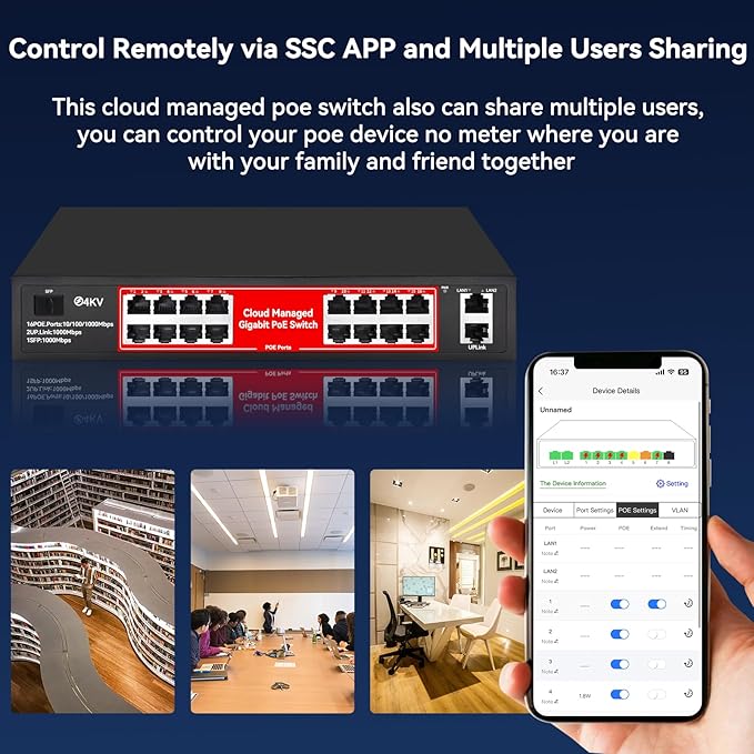 - Easy to Set-up And Cloud Managed PoE Switch: Connect devices securely, 19 port visibility, and simple cloud management with the mobile app and your computer; Alerts for connectivity problems and remote troubleshooting tools when needed. One-key to remote PoE function with mobile APP; Remote Access, feel free to Live check and solve the problems with your family or friends via POE Switch App wherever you are.(Please note: When adding a device for the first time, the switch needs to be connected to the Internet and powered on before the device can be activated.)
