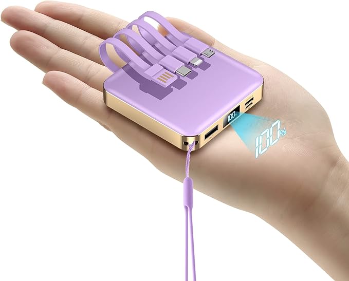 - 【4 Built-in Cables,No Extra Wires Needed】Equipped with 4 built-in cables (USB-A, Micro USB, Lightning, Type-C) and 2 output ports (Type-C, Micro USB), this portable charger can charge up to 5 devices simultaneously. Say goodbye to tangled cables and enjoy hassle-free charging anytime, anywhere.