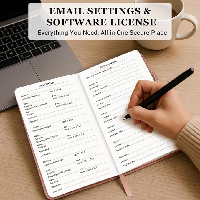 - All-In-One Password Book & More - This password organizer has space to store all the information you may need when you surf the web, including software license information, email settings, wireless router settings, and notes section.