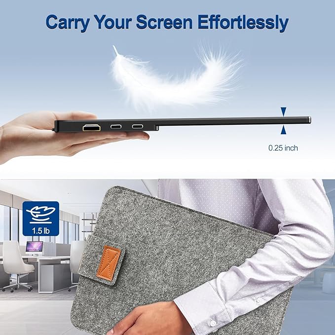 - [Portable Screen for Laptop] 1080P portable laptop monitor is made of reliable IPS A+ screen. Contrast ratio upgraded to 1200:1. With HDR and low blue light technology, it brings you more vivid images. Ultra-thin and lightweight, with a size of 13.9x8.7x0.25 inches and weighing only 1.5 pounds, it can be easily put into a backpack and used anywhere