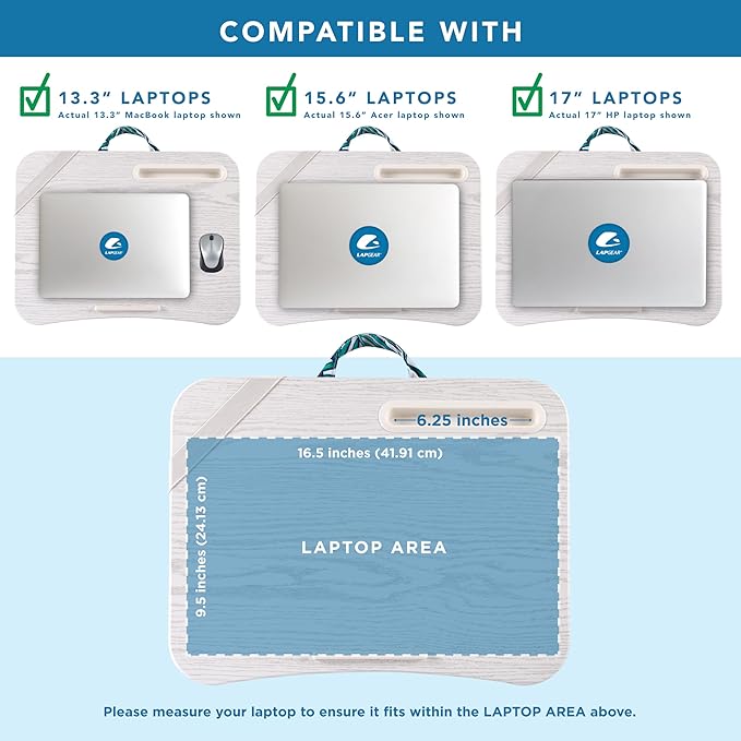 - Fits Laptops up to 15.6”: Solid 17.3" x 13.3" surface gives you a stable workspace for laptops, tablets, or notebooks anywhere.