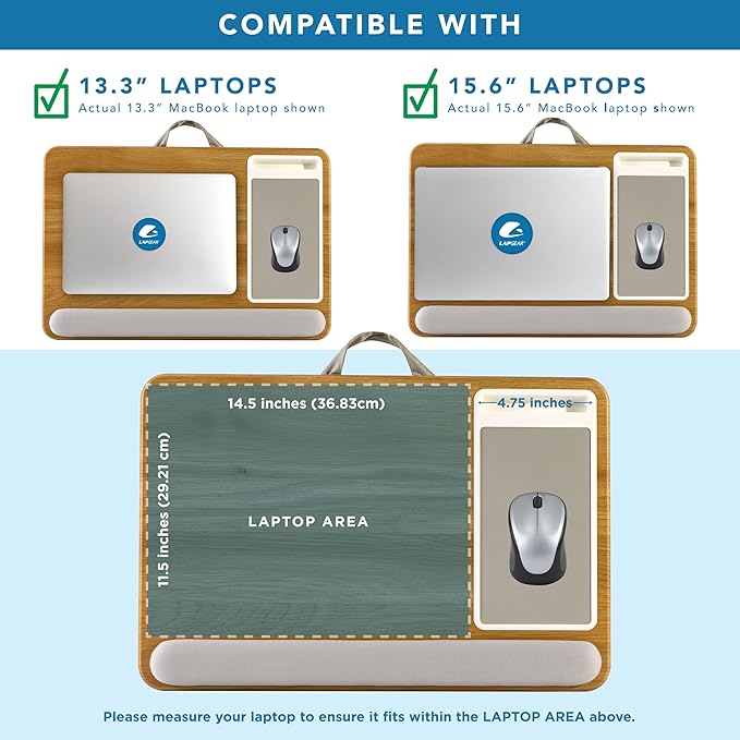 - Spacious Design: Measuring 21.1" wide and 14.1" deep, our lap desk comfortably fits most laptops up to 15.6". Extra room for accessories ensures convenience.