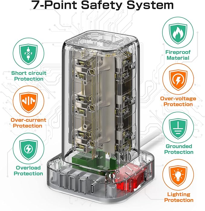 - 【Surge Protection & Overload Protection】- The surge protector tower with overload protection protects against spikes and fluctuations. The reset/off switch with integrated circuit breaker for overload protection of all outlets. This power strip has overload protection, short-circuit protection, over current protection, over-voltage protection and overheating protection. It will automatically cut power to protect connected devices when voltage surge is overwhelming.