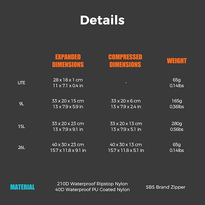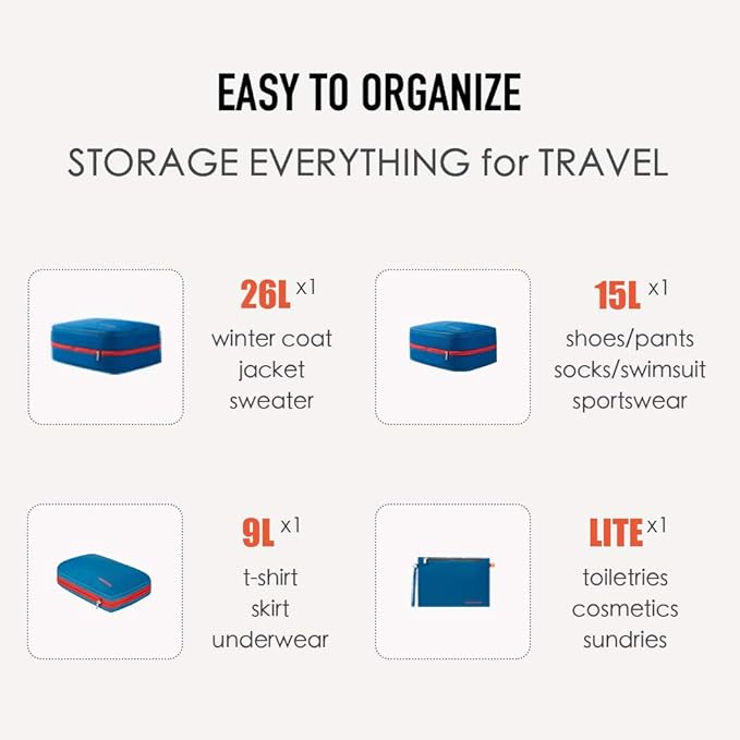 - PERFECT for TRAVEL - G4 includs 4 Pcs: 26L(XLarge) for winter coats, sweaters, pants. 15L(Large) for shoes, jeans, t-shirts and shorts. 9L(Medium) forunderwear, bras, socks, and smaller/thinner garments of clothing. LITE Gear Pouch for cards, cash, tech data cable, cosmetics, toiletry etc.