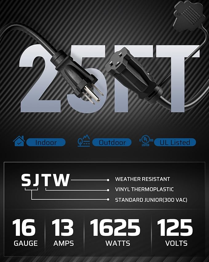 - 【Heavy Duty Extension Cord】Made of double sheathed copper wire and reinforced blades, protect prongs from bending or breaking; 16/3C SJTW power cord extension allows to supply multi appliances at the same time; be careful not to exceed the rated power 13A 125V 1625W