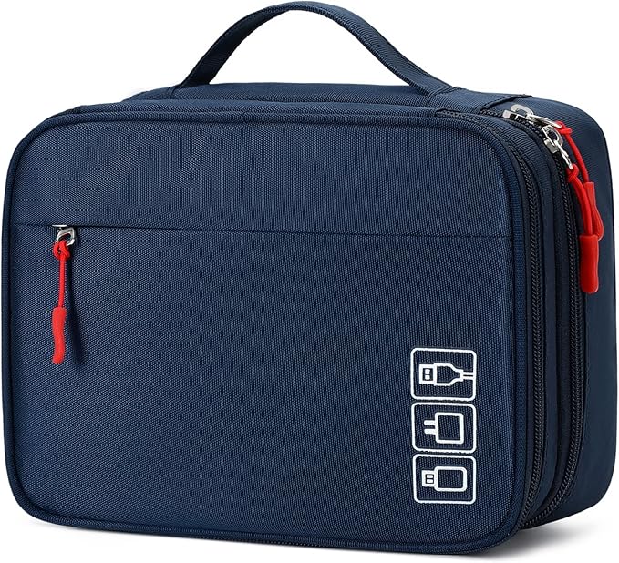 - Large Capacity: L9.4*W7.1*H4.3 inches (24*18*11 CM). Double layers design has enough space to store your chargers, cables, adapters, power bank, earphones, sd card, mouse, wireless charging-pads, cords, smartwatch and any small electronic accessiories.